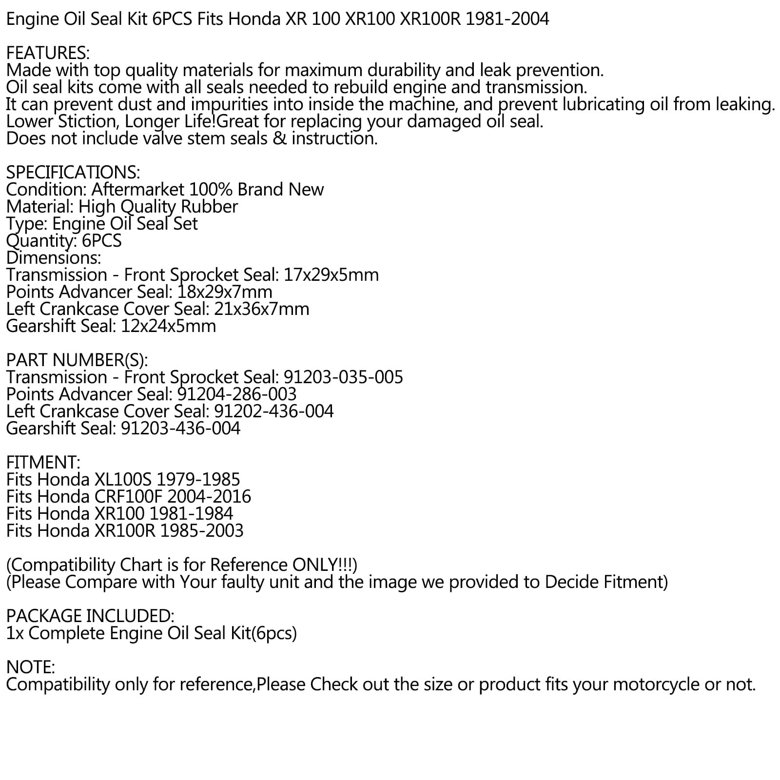 Areyourshop Engine Oil Seal Kit Set for Honda XR100 XR100R 81-03